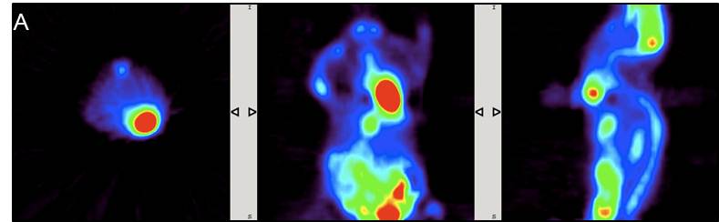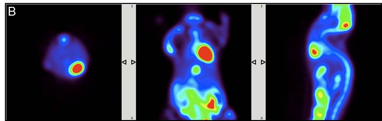 RECONSTRUCTION AND QUANTITATIVE IMAGE ANALYSIS: Imaging was performed using Inveon CT with image data set dimensions of 256 x 256 x 631 and at a given voxel size 0.173213 mm3. They were reconstructed using Filtered Back Projections (FBP) and Ordered-Subsets Expectation Maximisation (OSEM) 3D algorithms without scatter, random coincidence, dead time, decay and attenuation correction. Quantitative image analysis were performed by AMIDE software and manually drawing regions of interest (ROI) over the following: kidney, heart, liver, lung, muscle and bladder and left tumour. Mice were imaged when the tumour was around 11 and 9 mm. Uptake by [18F]-FDG tracer of various organs is quantified as standardised uptake values (SUVs) using the formula: [activity]tissue (MBq/mL)/injected dose (Bq) x body weight (g).
