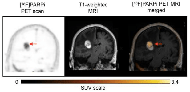Background: We report preclinical and first-in-human-brain-cancer data using a targeted poly(ADP-ribose)polymerase1 (PARP1) binding PET tracer, [ 18F]PARPi, as a diagnostic tool to differentiate between brain cancers and treatment-related changes.