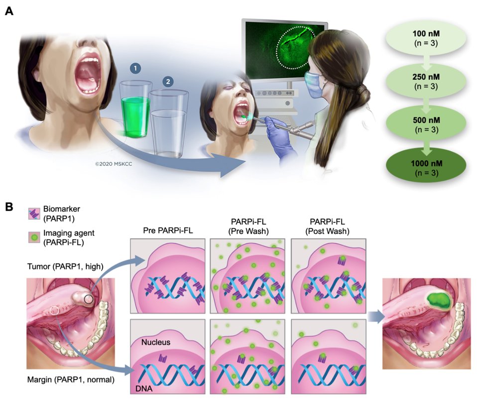 Translational Relevance Despite their accessible location, oral cavity cancers are often diagnosed late, especially in low-resource areas where their incidence is typically high. The high prevalence of premalignant and benign oral lesions in these populations contributes to a number of issues that make early detection of oral cancer difficult: even in experienced hands, it can be difficult to differentiate cancer from premalignant or benign lesions during routine clinical examination; and biopsy-based histopathology, the current standard of care, is invasive, prone to sampling error, and requires geographic access to appropriate health care professionals, including a highly trained pathologist. While seemingly impenetrable economic and infrastructure barriers have confounded the early diagnosis of oral cancer for most of the world’s population, these could be circumvented by a simple, in vivo, non-invasive, cost-effective, point-of-care method of diagnosis. We are attempting to address this unmet clinical need by using topically applied PARPi-FL — a molecularly specific, fluorescent contrast-based approach — to detect oral cancer.